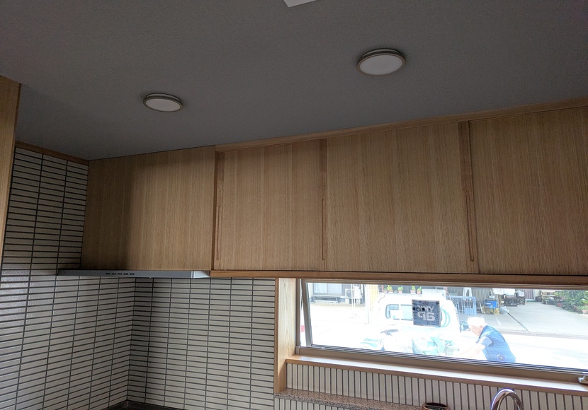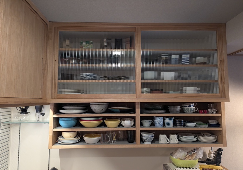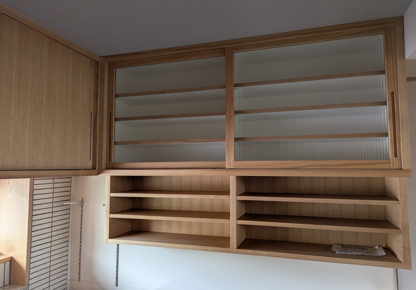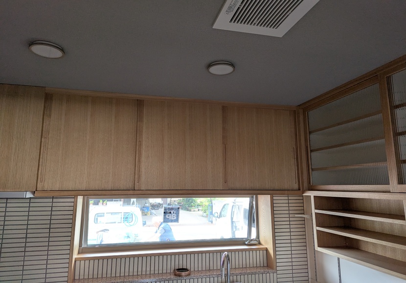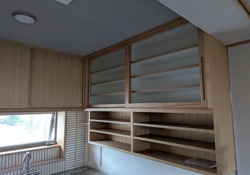 キッチンのレンジフードの高さに揃ってL型のスペースに納めました。